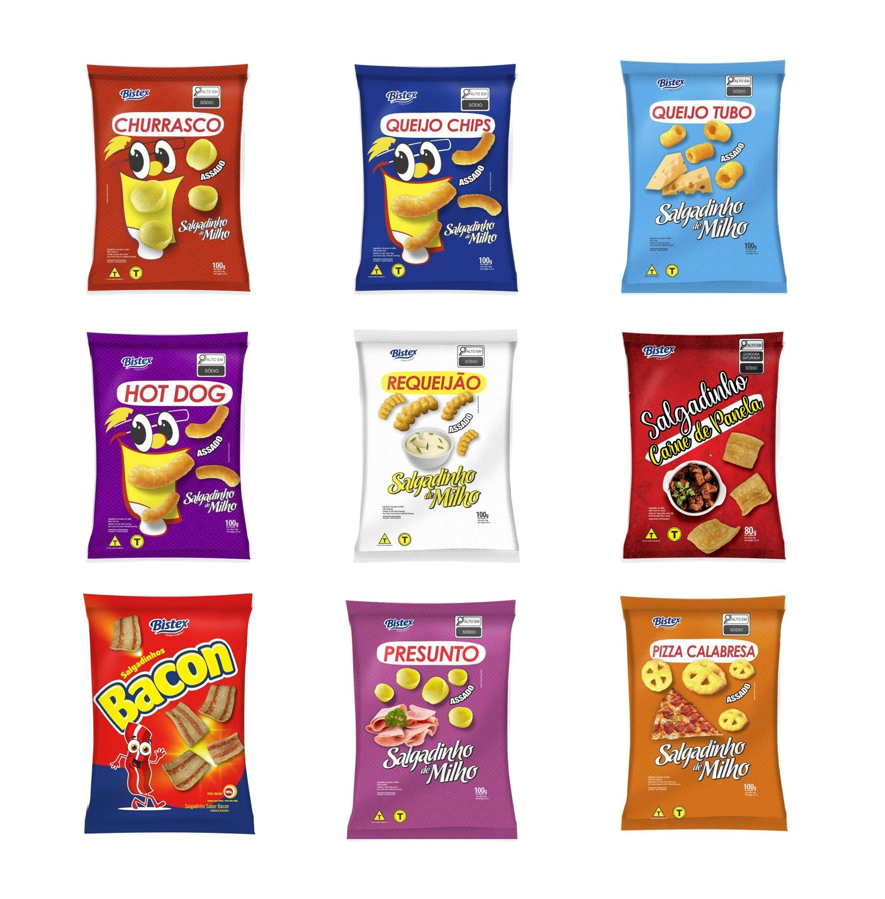 O salgadinho que carrega o apelido carinhoso de "bastantão". Embalagem de 100g generosa, sabores clássicos que funcionam em qualquer público: Bacon, Queijo, Presunto, Cebola e outros. Perfeito para consumo familiar e individual.